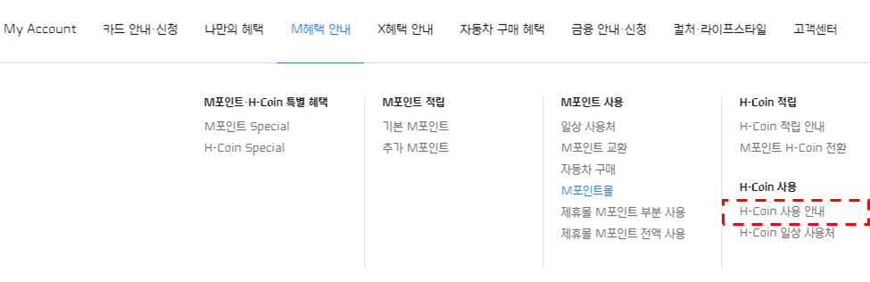 우선 현대카드 홈페이지로 가보자. 가서 M혜택안내 - M포인트 H-Coin전환 으로 가자
