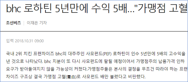 이 사모펀드 로하틴은 중간에 배당 유상감자로 쪽쪽 빨아먹고 투자금을 얼마안되서 다 뽑아먹었다. 젖과꿀이 흐르는 BHC였다. 과연 그 배당금은 누구 주머니에서 나왔을까? 당연히 가맹점들이 희생한 결과겠지. 평범한 우리 어려운 사장님들이 십시일반해서 외국계 사모펀드 배불려준 꼴이다.