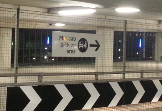 우선 당황하지 마시고, 저 문으로 쭉나가면 Mini Cab / Private hire Pick up area라는 이정표가 있습니다. 이렇게 생겼지요. 만약에 못찾으시면, 주의 사람들한테 Pick Up Area 가 어디냐고 물어보세요.